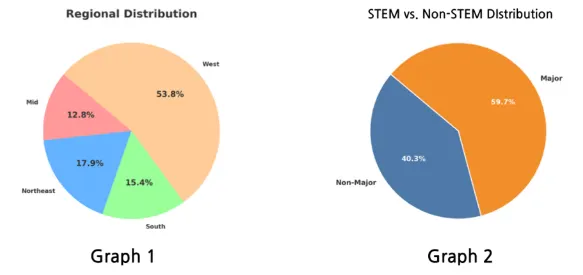 Left: (Graph 1) Regional Distribution and Right: (Graph 2) STEM vs. Non-STEM Distribution of Class of 2023-2024